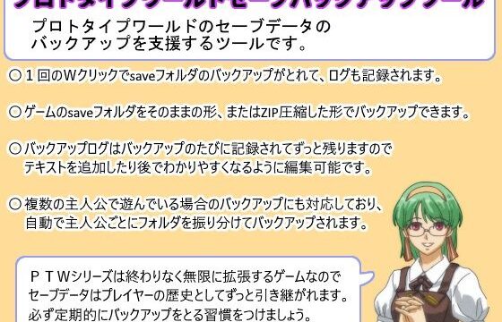 プロトタイプワールドのセーブデータのバックアップを支援するツールです。〇1回のWクリックでゲームのsaveフォルダのバックアップがとれて、 ログも記録されて残ります。〇ゲームのsaveフォルダをそのままの形、またはZIP圧縮した形で バックアップできます。〇バックアップログはバックアップのたびに記録されてずっと残りますので テキストを追加したり後でわかりやすくなるように編集可能です。〇複数の主人公で遊んでいる場合のバックアップにも対応しており、自動で 主人公ごとにバックアップフォルダを振り分けてバックアップされます。元々開発テスト用につくったものですが、製品用に機能を追加してみました。手動でバックアップするよりは楽になるかと思います。PTWシリーズは終わりなく無限に拡張するゲームなので、セーブデータはプレイヤーの歴史としてずっと引き継がれます。不慮の事故によるデータ喪失を防ぐために、必ず定期的にバックアップをとる習慣をつけましょう。※本ツールはPTW2022のセーブデータから対応しています。PTW2022以降の作品のセーブデータにも対応していますが、PTW2019のセーブデータには対応していませんのでご注意下さい。PTW2019のセーブデータはPTW2022に移行してからご利用下さい。